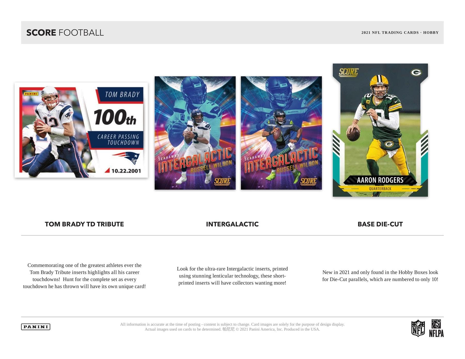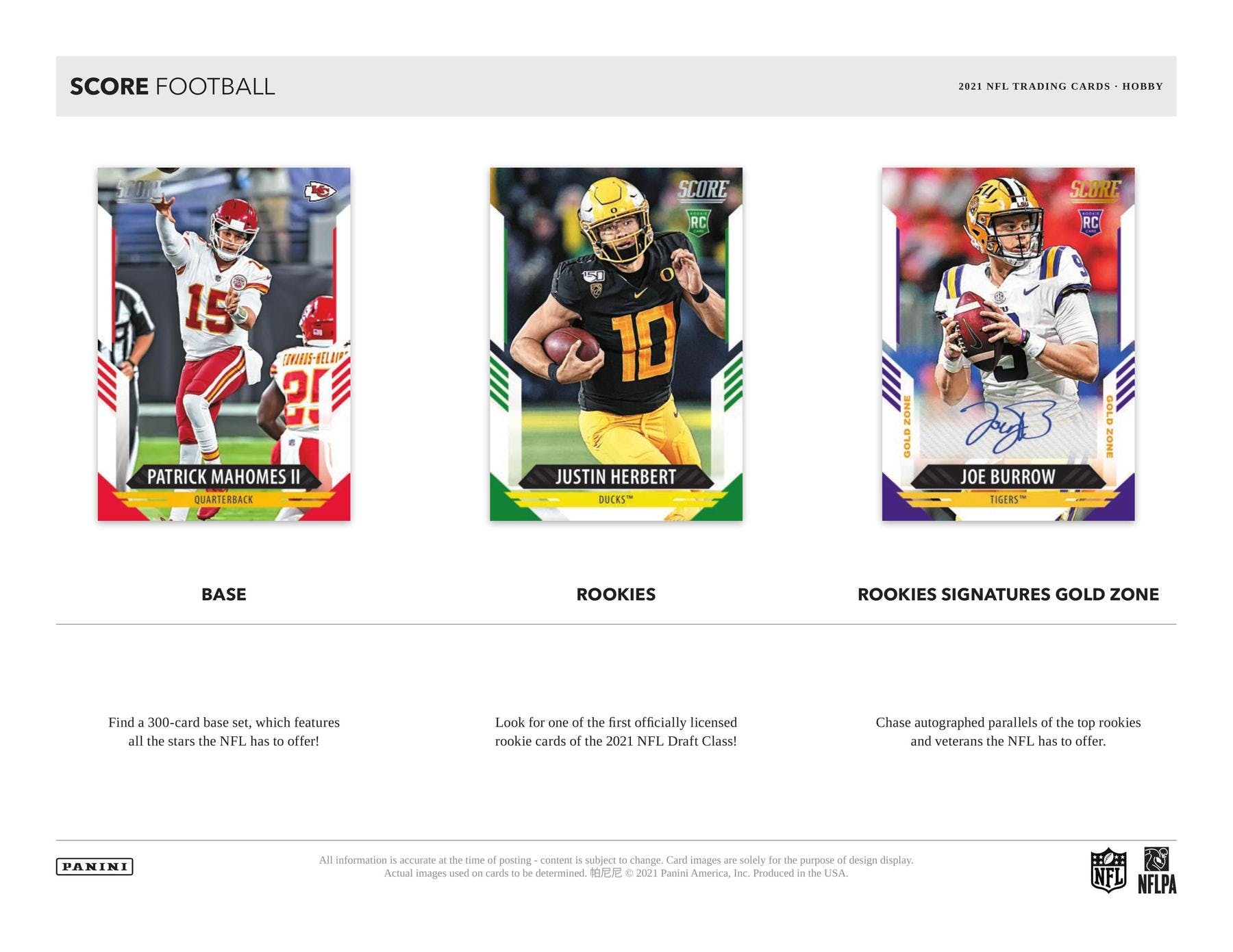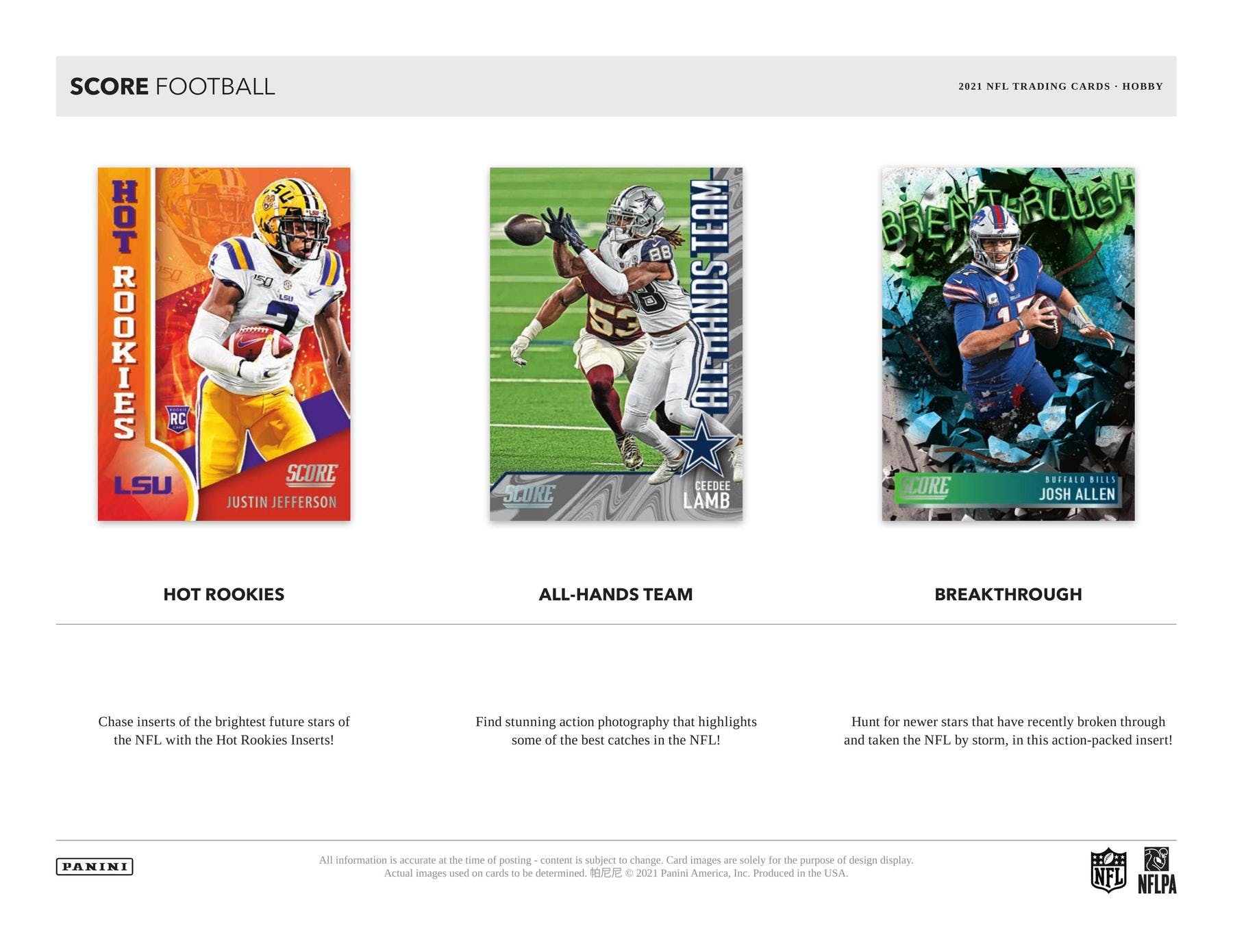 The first officially licensed NFL product of 2021, Score is loaded with new rookies, inserts, parallels and autographs!