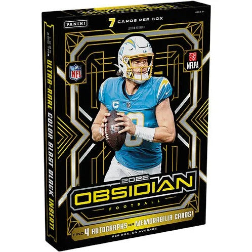 Each 2022 Panini Obsidian Football Hobby Box contains 4 Autographs or Memorabilia Cards, 2 Parallels or Inserts and 1 Base Card!