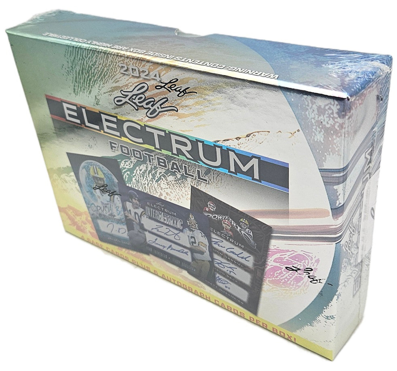 With football season right around the corner Leaf is excited to announce its newest addition to its football product portfolio with 2024 Leaf Electrum Football! No other product in the market today will have such a unique combination of future, present and past stars of the game. Look for exciting interactive insert called Crystal Ball. This redemption qualifies you for an auto of the player depicted on the card if he succesfully completes the achievement listed. Electrum features Leaf's brand new exclusive micro-etched holofoil technology. There will be 2 Crystal Ball redemption cards, 2 Legend autos and 1 multi-signed card on average per case.