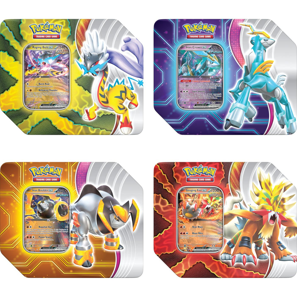 metallic mastery. In this Paradox Destinies Tin, you’ll find a promo card featuring one of these four Paradox Pokémon, additional allies to add