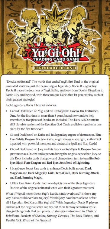 “Exodia, obliterate!” The words that ended Yugi’s first Duel in the original animated series are just the beginning in Legendary Decks II! Legendary Decks II traces the journeys of Yugi, Kaiba, and Joey from Duelist Kingdom to Battle City and beyond, with three unique Decks that let you employ each of their greatest strategies!