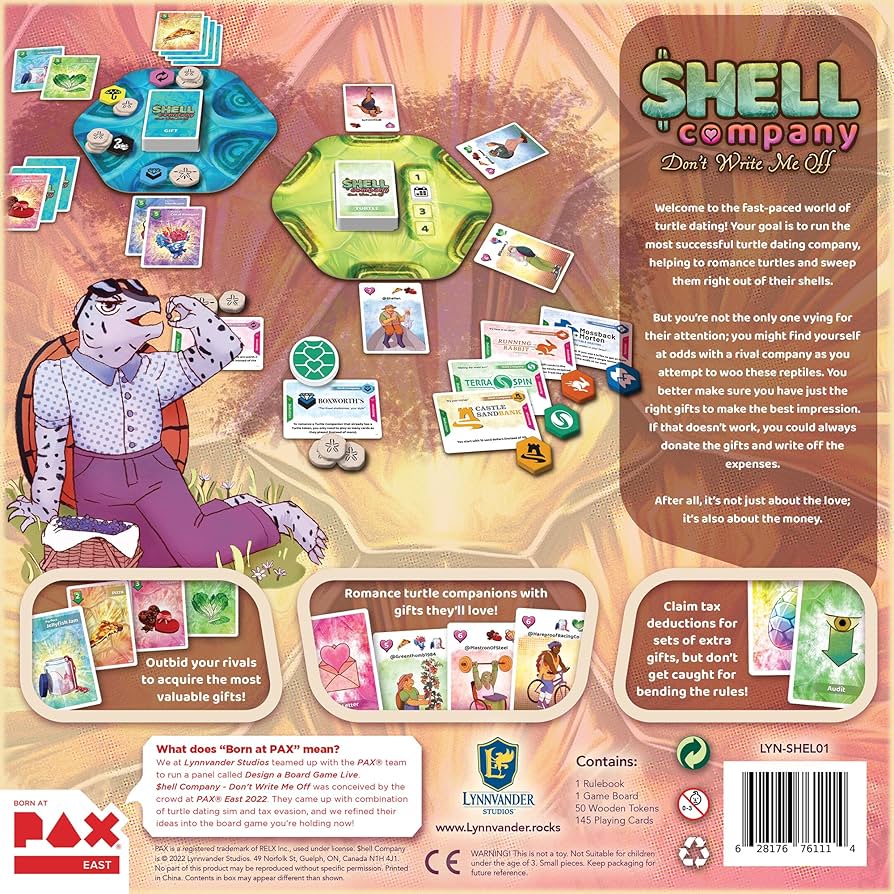 Shell Company - Don’t Write Me Off is the first in a series of games Born at PAX®. What does “Born at PAX” mean? We at Lynnvander Studios teamed up with the PAX team to run a panel called Design a Board Game Live. Shell Company - Don’t Write Me Off was conceived by the crowd at PAX East 2022. They came up with the combination of turtle dating sim and tax evasion, and we refined their ideas into the board game you’re holding now!
