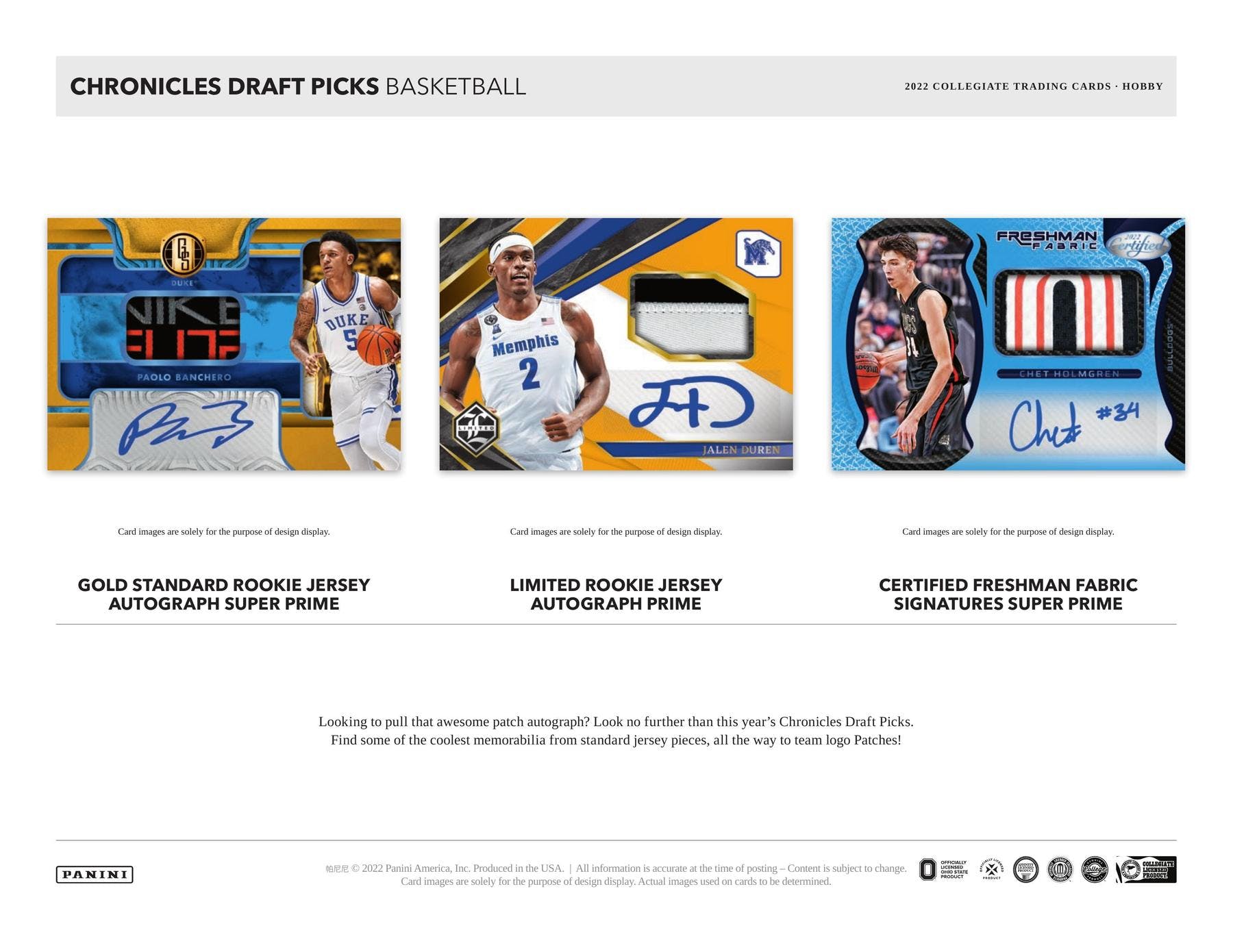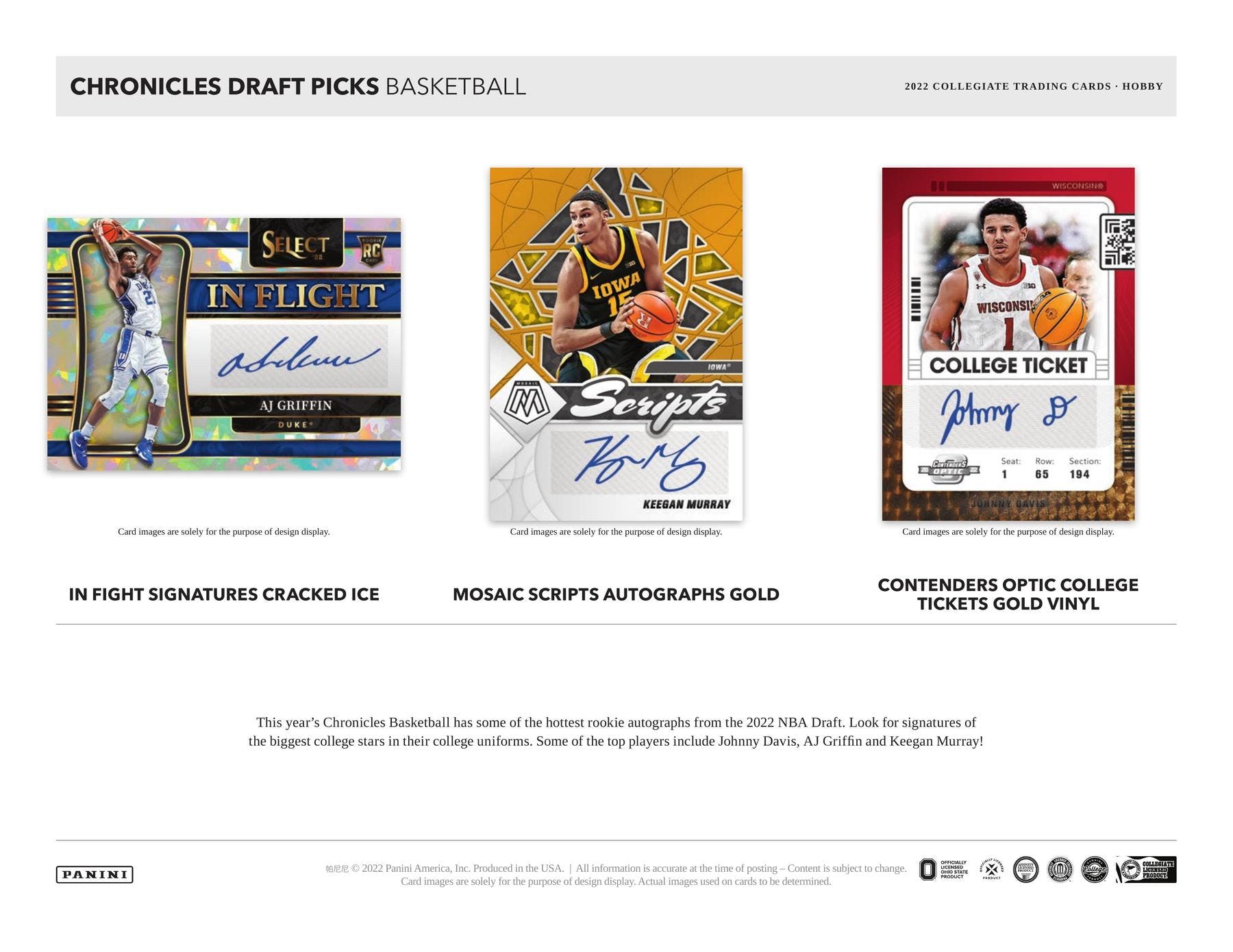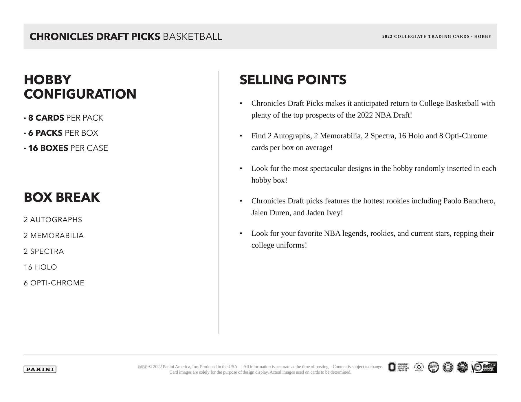 Chronicles Draft picks features the hottest rookies including Paolo Banchero, Jalen Duren, and Jaden Ivey! Look for your favorite NBA legends, rookies, and current stars, repping their college uniforms!