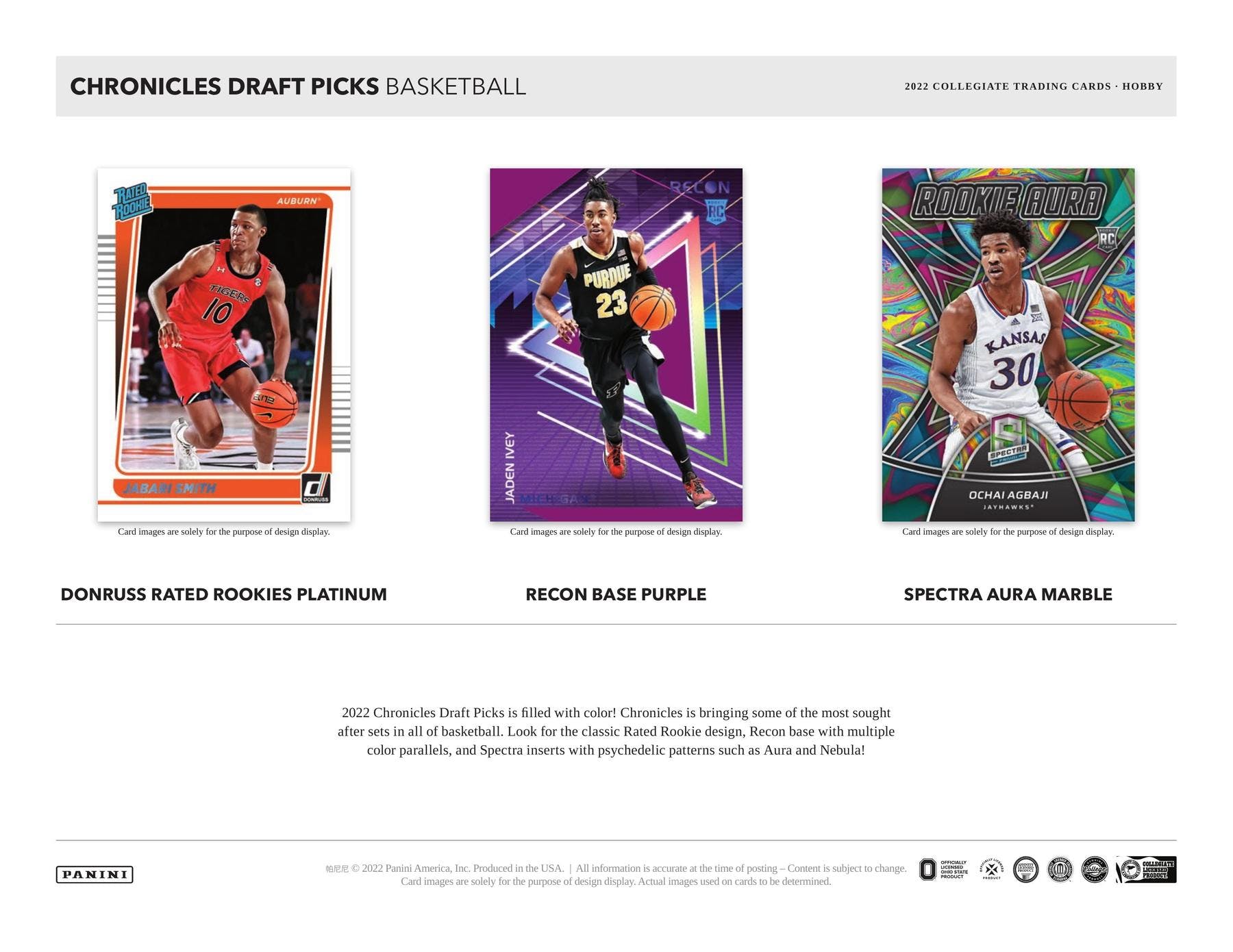 2022 Chronicles Draft Picks is filled with color! Chronicles is bringing some of the most sought after sets in all of basketball. Look for the classic Rated Rookie design, Recon base with multiple color parallels, and Spectra inserts with psychedelic patterns such as Aura and Nebula!