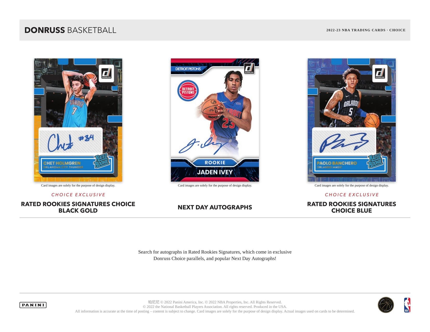 RATED ROOKIES SIGNATURE CHOICE / NEXT DAY AUTOGRAPHS: Search for autographs in Rated Rookies Signatures, which come in exclusive Donruss Choice parallels, and popular Next Day Autographs!
