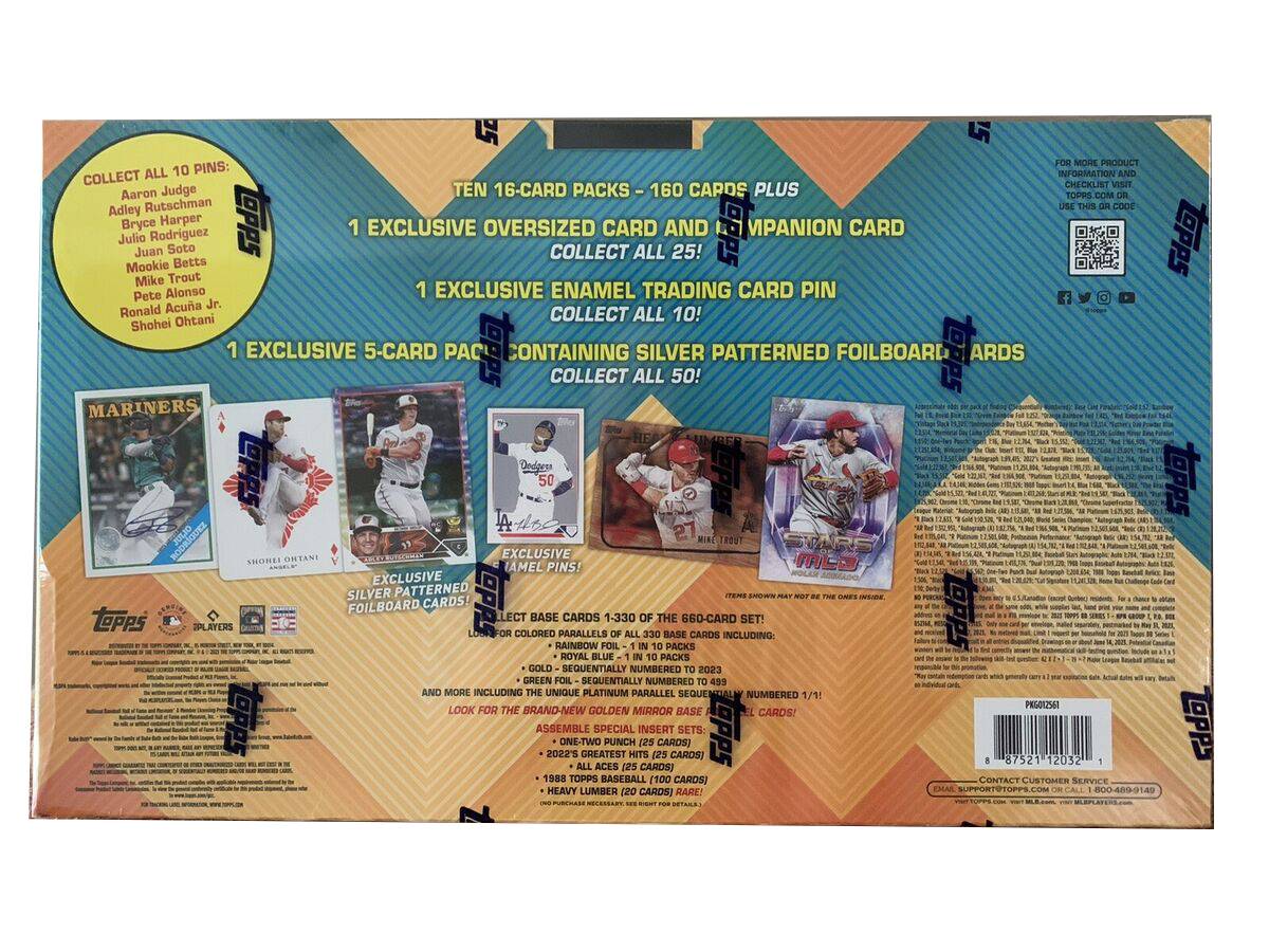 Each pack includes 1 exclusive Oversized Card and Companion Card, 1 Enamel Trading Card Pin, and a 5-card pack with Silver Patterned Foilboard cards. Look out for autographs and relic cards of the league’s current stars, greats from the past, and rising rookies. Celebrate the 2023 baseball season with this ultimate collector's set.