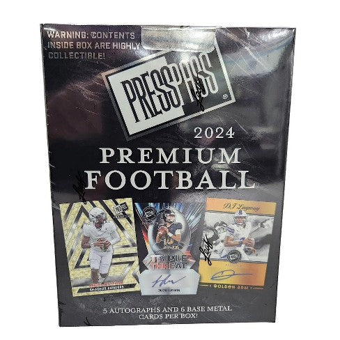 Leaf is proud to announce the return of a longtime hobby favorite, Press Pass Football! 2024 Leaf Press Pass Premium will bring you the top football players from the past, present and future all on metal technology. Look for the return of some fan favorite inserts and even more rare die-cut autograph cards. Every box, on average, will contain 4 base, 2 base parallels #'d to 35 or less, 4 autograph or retro autograph cards #'d to 99 or less plus 1 insert autograph or die-cut autograph #'d to 25 or less!