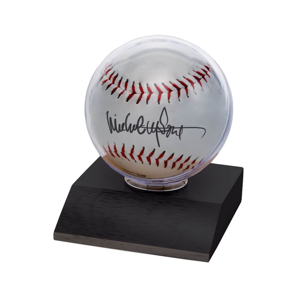Baseball is displayed on a sleek black wood stand that is sure to fit any decor
